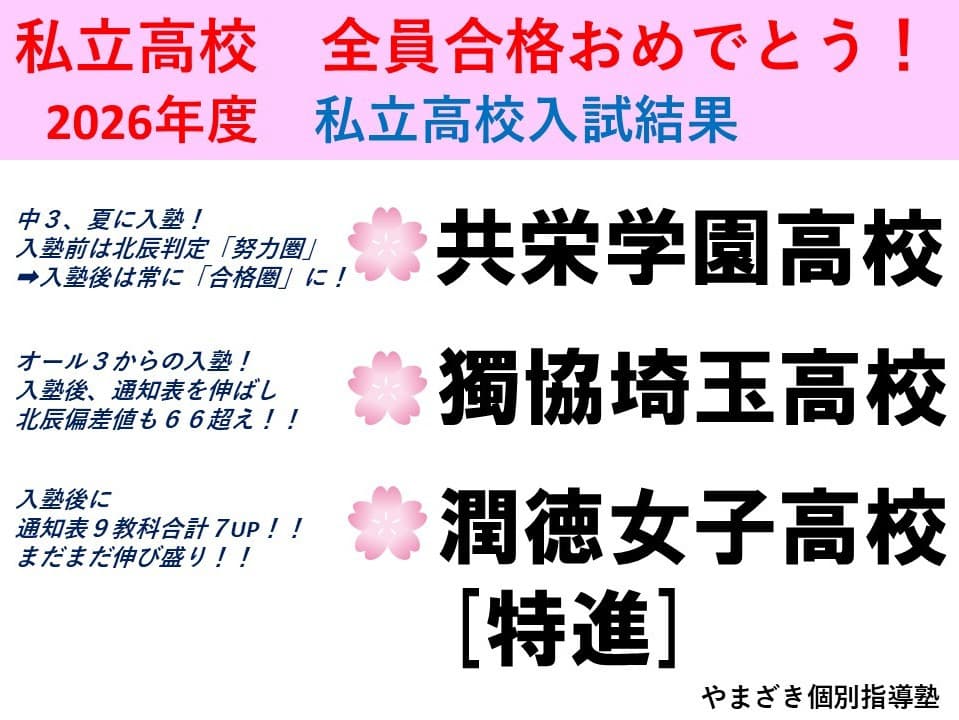 | 2026/01/31 | 私立高校入試の合格速報を掲載しました |